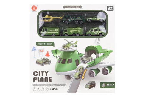 Rozkladacie lietadlo s autíčkami. Lietadlo je možné rozložiť na garáž pre autíčka. Súčasťou je 6 vojenských autíčok a 1 helikoptéra. Rozmery balenia cca 29 x 30,5 x 10,5 cm. Vek 3+