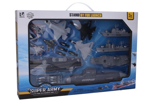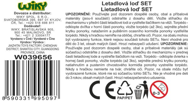Lietadlová loď s katapultom 25 cm set s ponorkou. Obsah balenia - lietadlová loď na zotrvačník s katapultom na stíhačky 25 cm, ponorka s vystreľovaním torpéd 28 cm na zotrvačník, lietadlová loď 18 cm, bojová loď 16 cm, bojový krížnik 14 cm, 3x stíhačka voľné kolesá 12 cm 12x torpédo do ponorky. Katapult - vložte stíhačku do pružiny v prednej časti lietadlovej lode, vystrelenie tlačidlom na veži. Torpédo - odklopte dvierka v hornej časti ponorky - vložte torpédo (max 3), snímte prednú krytku ponorky, natiahnutím a pustením chvostového kormidla ponorky vystrelíte torpédo. Obrázkový návod na obale.