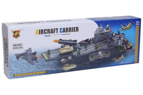Lietadlová loď s vozidlami a vojakmi set. Rozmery 47,5x21x14,5 cm. Návod na zostavenie na obale. Manuálne pohyblivé prvky bez efektov.