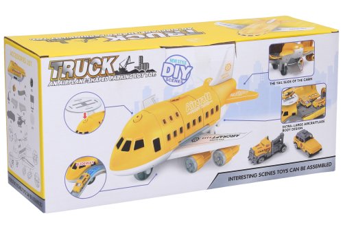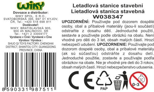 Lietadlová stanica stavebná. Rozmery 30x29x14 cm. Súčasťou 4 autá, 1 vrtuľník. Voľné kolesá. Obsahuje lietadlovú stanicu, 4 malé dopravné prostriedky, dráhu, heliport, značky, kužele. Obrázok na zostavenie na bočnej strane obalu.