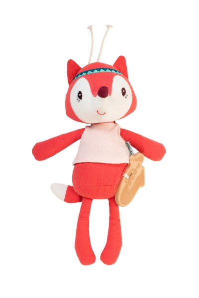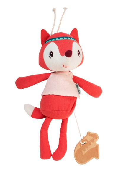 Textilná hračka pre deti už od narodenia. Líška Alice má vo vnútri ukrytý hudobný strojček. Rozmery hračky sú 30 x 11 cm. Možno prať v práčke na 30 ° C na jemný cyklus po odobratí hudobného strojčeka a dreveného nástroja. Použité materiály: 100% organická bavlna a FSC drevo. Výplň hračky je 100% recyklovaný polyester (certifikácia GRS).