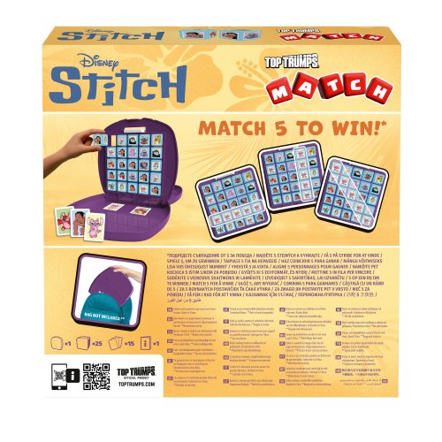 Lilo & Stitch Match dosková hra. Dosková hra pre 2 hráčov. V plastovom kufríku na cesty. Snažte sa usporiadať obrázky na kockách tak, aby ste utvorili horizonálny, vertikálny, alebo diagonálny rad tvorený z rovnakých obrázkov. Veľkosť rozloženého kufríka (herné plochy) - 41x26,5x20,8 cm.