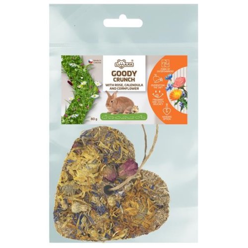 Bezobilné bylinkové srdce s nechtíkom, nevädzou a ružou poskytne králikom a hlodavcom zdravú odmenu, zábavu a príjemné spestrenie jedálnička. Maškrtu je možné vďaka prírodnému povrázku zavesiť do ubikácie. Hlavné prednosti: