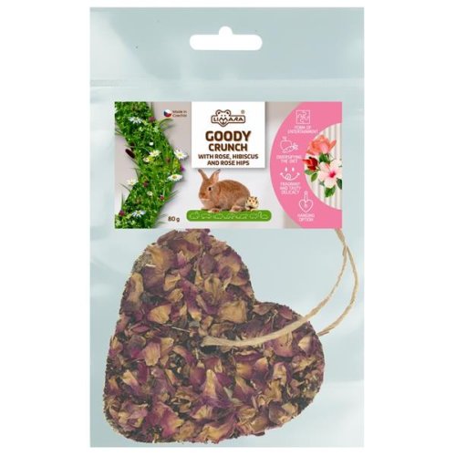 Bezobilné bylinkové srdce so šípkou, ružou a ibištekom poskytne králikom a hlodavcom zdravú odmenu, zábavu a príjemné spestrenie jedálnička. Maškrtu je možné vďaka prírodnému povrázku zavesiť do ubikácie. Hlavné prednosti: