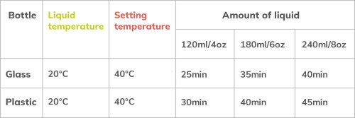 Sada obsahuje: ohrievač fliaš, pútko, USB kábel, návod na použitie. Hmotnosť výrobku: 0,26 kg. Rozmery ohrievača: vonkajšie 8,5 x 8 x 13 cm, vnútorné 7 x 7 x 10 cm. Batéria: Lítium-iónová 7,4V 3000 mAh.