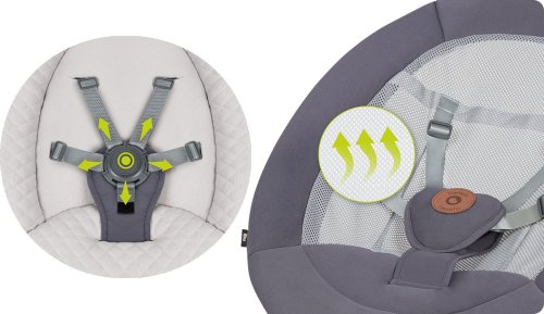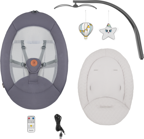 profilované otočné sedadlo s mäkkým vankúšikom a sieťovaným poťahom nízka hmotnosť = ľahké prenášanie nastavenia sklonu operadla do 2 polôh (poloha poležiačky alebo poloľahu) automatická detekcia pohybu 5 rýchlostí hojdania dva smery hojdania: vpred-vzad, vľavo-vpravo vstavaný časovač na 8,1 30 minút prehrávania 12 melódií, ovládanie hlasitosti ovládanie pomocou dotykového panelu alebo diaľkového ovládača 2 spôsoby napájania: batérie alebo zo siete pomocou cez USB kábel (súčasťou balenia 1,2m) pre prevádzku je potrebné 4 ks 1,5V batérie AA,LR6 (nie sú súčasťou balenie) odnímateľná hrazdička s 2 hračkami snímateľný poťah možno prať v práčke max na 30 ° C * 5-bodové bezpečnostné pásy protišmykové kryty - chráni podlahu proti poškriabaniu.