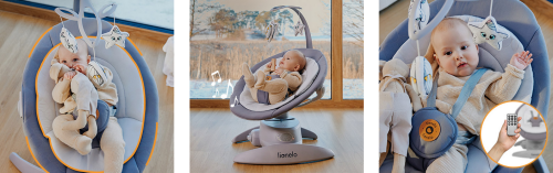 určené pre deti od narodenia do doby, než dosiahnu hmotnosť 9 kg alebo zvládnu samostatne sedieť široké, vhodne tvarované lehátko zaisťuje pohodlnú a bezpečnú polohu dieťaťa 5 stupne nastavenia rýchlosti 5 bodové bezpečnostné pásy s polstrovaním v rozkroku ovládací panel je v strednej časti základne prehrávanie 14 melódií (12 melódií + 2 zvuky prírody) ovládanie prostredníctvom priloženého ovládača bluetooth pripojenie k prehranie hudby podľa vlastného výberu napájania 2 spôsobmi: 4 ks 1,5V batérie AA (nie sú súčasťou balenia) alebo USB kábel (súčasťou balenia - používajte so sieťovým adaptérom 5,8V DC 0,8A) odnímateľná hrazdička s hračkami maximálnu nosnosť 9 kg možno prať ručne jemným pracím prostriedkom pri max. teplote 30°C