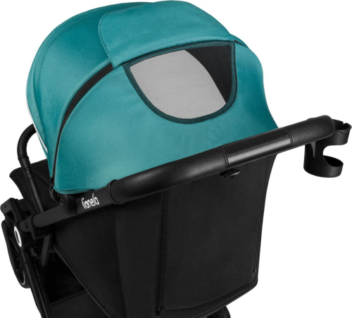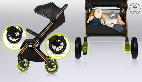 bezúdržbové kolesá z peny EVA s tlmičmi nárazov z PU, otočné predné kolesá o 360 °, nastaviteľné operadlo až do ležiacej polohy, nastaviteľná nepremokavá XXL strieška s filtrom UPF50 + as okienkom, reflexné prvky, 5 bodové bezpečnostné pásy, opierka na nohy click+amp;ride umožňuje rodičom robiť dlhé kroky a nožná brzda zaručí bezpečné zastavenie, nákupný kôš s maximálnou nosnosťou 3kg, držiak na nápoje, nánožník, automatické skladanie po stlačení tlačidla, špeciálny poťah a pás na prenášanie zloženého kočíka.