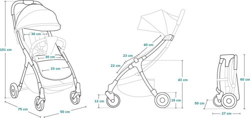 Rozmery zostaveného kočíka: 50 x 75 x 101 cm Rozmery zloženého kočíka: 60 x 50 x 27 cm Nosnosť: 22 kg Hmotnosť kočíka: 6,6 kg Výrobok spĺňa požiadavky Európskej bezpečnostnej normy EN 1888.
