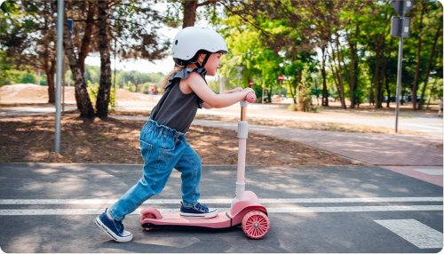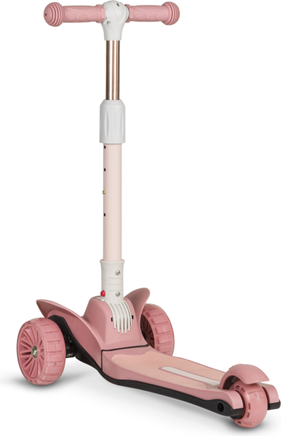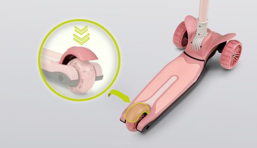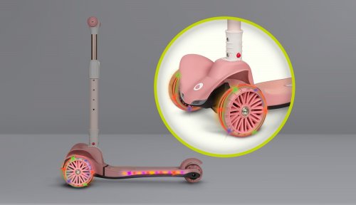 trojkolesová pre lepšiu stabilitu ergonomický tvar 4stupňové nastavenie výšky riadidiel (64,68,72,76) plošina s protišmykovou úpravou brzda integrovaná do zadnej nápravy predné kolesá: 12" zadné koleso: 8" ložiská: ABEC-7 veselé farby LED svetlá v kolieskach napájaná pri pohybe LED svetla v plošine napájaná batériami vhodné pre domáce aj vonkajšie použitie