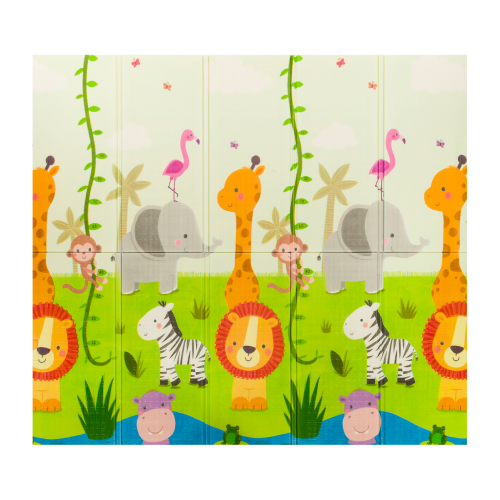 Farebná obojstranná potlač - Safari a Mapa mesta, grafika môže inšpirovať rodičov k rozprávaniu príbehov o zvieratách alebo živote v meste, textúrovaný povrch s protišmykovou úpravou, z pevnej a pružnej peny XPE - dostatočne tvrdá pre správnu oporu dieťaťa, keď sa snaží zdvihnúť a dostatočne mäkká , aby tlmila prípadné pády, neobsahuje PVC, ftaláty, formamid, fenoly ani formaldehyd, účinne izoluje od studených podláh, vodeodolná, neabsorbuje vlhkosť ani pachy, veľmi priestranná 180 x 200 x 1 cm, ľahko sa čistí, vhodná na použitie doma aj vonku alebo na výlety, ľahké zloženie do kompaktných rozmerov, praktická taška s uchom (na prepravu alebo skladovanie) .