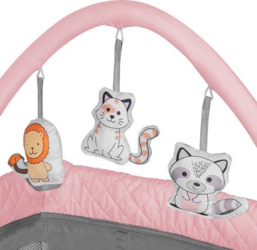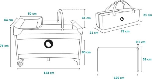 2v1 = postieľka a ohrádka, ľahké skladanie a rozkladanie, prebaľovací pult so zvýšenými okrajmi, vrecká a priehradky na rôzne potreby, oblúk s hračkami, bočný vchod so zipsom, 2-úrovňové nastavenie výšky matraca, matrac 120 x 60 x 5 cm z peny sa zvýšenou pružnosťou, zámok LockGuard proti samovoľnému zloženiu, 2 kolieska pre ľahké premiestňovanie, praktická prepravná taška na cesty.