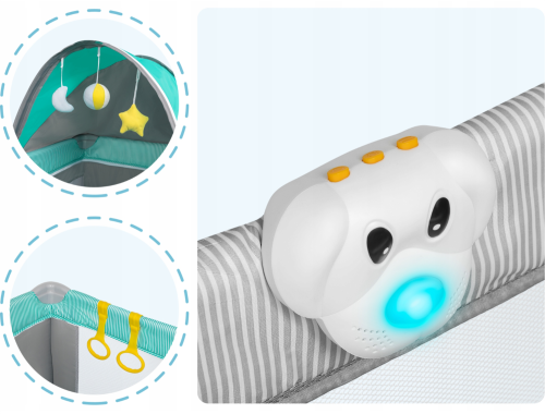 bočný vchod so zipsom + zámok sieť proti hmyzu madla pre učenie stúpania bez ostrých hrán kvalitná mäkká podložka odolná proti oderom systém LockGuard proti nechcenému zloženiu melódie a interaktívny pes nastavenie výšky matracov do 2 rôznych úrovní prebaľovací pult + postranný panel s 3 vreckami overená kvalita od certifika spoločnosti SGS kolesá s brzdou a pevné nohy
