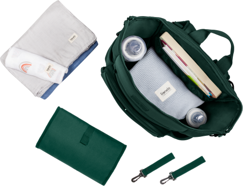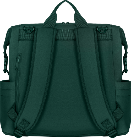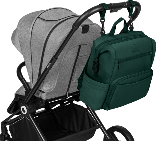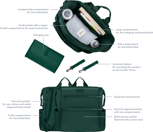 multifunkčný batoh na chrbát, na kočík alebo ako samostatný doplnok - vrecko na prebaľovanie môže slúžiť na tablet alebo notebook vyrobené z pevného nepremokavého neoprénu je možné prať v práčke rozmery: 36 x 36 x 23 cm zapínanie na zips 12 praktických vreciek a priehradok odmietateľné univerzálne pripevnenie k akémukoľvek modelu kočíka pomocou praciek je možné zmenšiť veľkosť batohu tak, aby sa zmestil aj pod sedadlo v lietadle