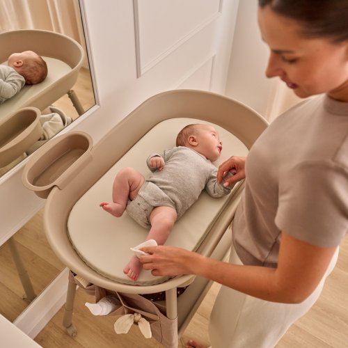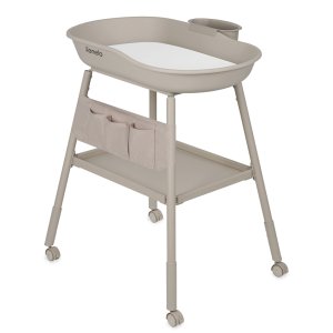 Nádobka s funkciou misky: Odnímateľnú bočnú nádobu môžete pripevniť na ktorúkoľvek stranu prebaľovacieho pultu, aby ste priestor dokonale prispôsobili svojim potrebám. Skvelý na uloženie obrúskov a kozmetiky alebo ako miska s vodou na omývanie.