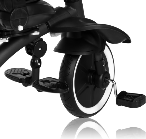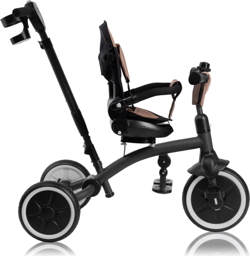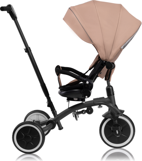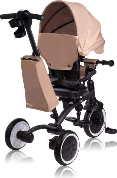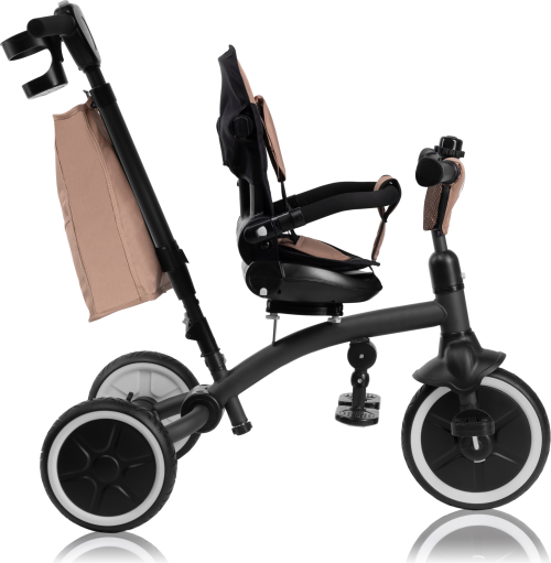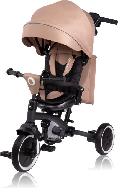 otáčacie sedadlo s polstrovaním na celej ploche 3bodové bezpečnostné pásy pre malé deti protišmyková rukoväť so zvončekom súčasťou je priestranná taška na potrebné veci a držiak na nápoje pod riadidlami jednoduché skladanie do kompaktnej veľkosti brzda na zadných kolesách Výškovo nastaviteľná rukoväť pre rodičov: 80 - 100 cm otáčajúce sa kolesá Podnožka pre najmenšie deti Podnožka pre staršie deti Nastaviteľná opierka chrbta Nastavenie sedadla vpredu, vzadu Zadné kolesá s nezávislými brzdami Reflexné lemovanie na strieške Extra polstrovanie na sedadle a operadle veľkosť predného kolesa 26 cm veľkosť zadných kolies 23 cm Nastavenie operadla v