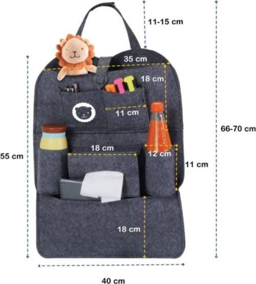 Je určený na montáž na zadnú stranu predných sedadiel automobilov. Možno pripevniť zhora pomocou pásikov na suchý zips a zospodu pomocou elastických pásikov so slučkou. 7 praktických vreciek: veľké vrecko na suchý zips v hornej časti pre väčšie predmety, 2 zvislé ploché vrecká uprostred na menšie predmety, 2 vonkajšie hlbšie a širšie vrecká na nápoje, stredové vrecko s otvorom napr. pre vreckovky, veľké vrecko v spodnej časti. Univerzálna farba. Pohodlný a praktický.
