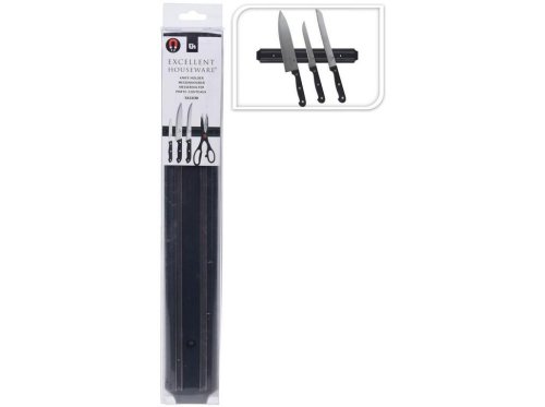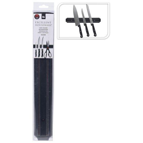 Magnetická lišta na nože, s dĺžkou 33 cm, je praktický pomocník do každej kuchyne. Vďaka nej budete mať nože neustále po ruke. Povrch lišty je z plastu, v čiernej farbe. Pevné uchytenie nožov zaisťuje dvojica silných magnetických pásikov. Magnetickú lištu je možné uchytiť prakticky na akúkoľvek stenu. Upevňovací materiál je súčasťou balenia.