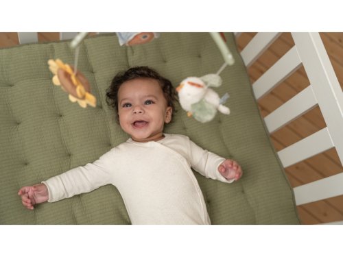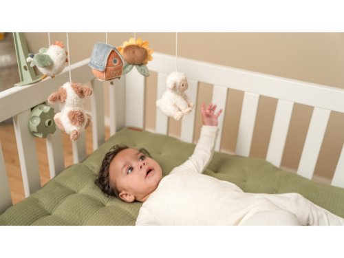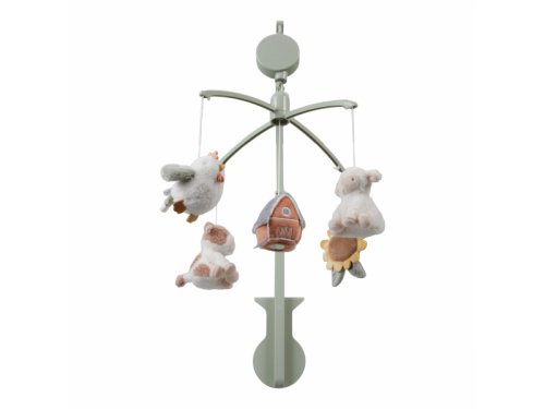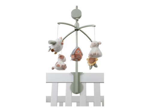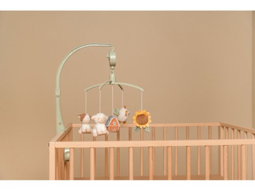 Kolotoč s naťahovacím hudobným boxom hrá nežnú uspávanku pre pokojné zaspávanie. Pozornosť dieťaťa upútajú otáčajúce sa plyšové hračky v podobe ovečky, sliepočky, kravičky, slnečnice a domčeka. Kolotoč ľahko pripevníte na bočnicu postieľky.