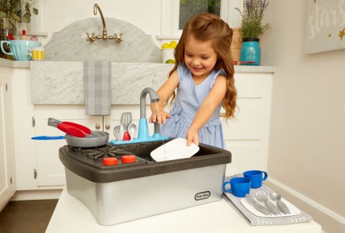 Little Tikes Môj prvý drez je interaktívna hračka navrhnutá tak, aby vyzerala realisticky, takže deti môžu predstierať, že umývajú riad rovnako ako ich rodičia.
