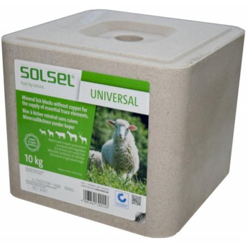 Soľný minerálny liz Solsel bez medi pre ovce, kozy, kone, dobytok a zver 10 kg - schválené pre využitie v ekologickom poľnohospodárstve. Soľný liz obohatený minerálmi pre všetky hospodárske zvieratá zver, najmä pre ovce a kozy. Vedľa soli (chloridu sodného) spotrebuje každé zviera celý rad ďalších minerálov. Stopové prvky s preukázaným biochemickým významom sú zinok, mangán, meď, železo, jód, kobalt a selén. Každý z týchto prvkov plní dôležité úlohy v organizme zvieraťa. Individuálna potreba minerálov každého zvieraťa sa však môže značne odlišovať – aj vo vnútri rovnorodých vekových alebo úžitkových skupín. Minerálne lizy SOLSEL pre ovce, zaistia vedľa základného a jadrového krmiva ďalšie spontánne doplnenie minerálov soľným lizom. Pri receptúre tohto špeciálneho lizu pre ovce, bolo upustené od použitia medi, aby sa predišlo neznášanlivosti typické pre tento druh zvieraťa. Minerálne lizy SOLSEL pre ovce sa vyrábajú z čistej kamennej alebo vákuovej soli s prídavkom špeciálnej minerálnej zmesi a lisované sú špeciálnou tlakovou metódou. Stála celistvosť kociek je výsledkom dlhého radu pokusov a permanentných testov tvrdosti. To zaručuje vysokú odolnosť poveternostným vplyvom, rovnako tak rovnomernú konzumáciu zvieraťom. Minerálne lizy SOLSEL pre ovce boli ako samostatné krmivo vyvinuté zvlášť pre ovce. Môžu byť ale bezpečne použité aj pri výkrme hovädzieho dobytka, koní, kôz, ošípaných alebo divokej zveri. Rozmery: 10 kg kocky o rozmeroch cca. 185 × 185 × 155 mm (d × š × v), priemer stredového otvoru cca.30 mm Trvanlivosť: 3 roky od dátumu výroby Podmienky skladovania: Musí byť zabezpečená ochrana pred vlhkosťou a kontamináciou a musí byť zabránené preniknutiu do podložia. Zloženie: Sodík 38 % Vápnik (Ca) 0,5 % Horčík (Mg) 0,1 % Fosfor (P) 0 % Mangán (oxid mangánatý) 1000 mg/kg Zinok (oxid zinočnatý) 1000 mg/kg Železo (uhličitan železnatý) 200 mg/kg Jód (jodičnan vápenatý) 100 mg/kg Kobalt (uhličitan kobalnatý) 20 mg/kg Selén (seleničitan sodný) 20 mg/kg As Max. 12 mg/kg F Max. 2000 mg/kg Cd Max. 5 mg/kg Pb Max. 15 mg/kg Hg Max. 0,2 mg/kg