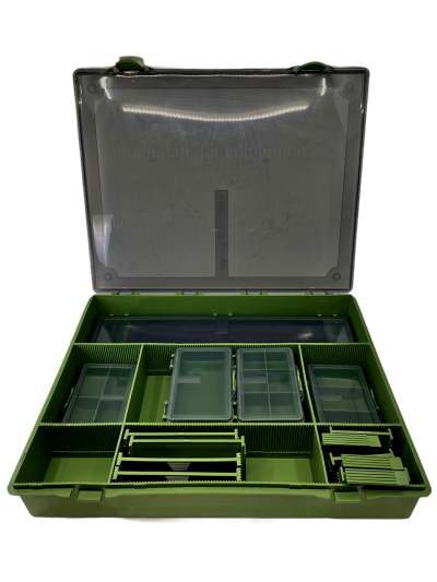 LK Baits CARP BOX MULTI – Veľmi univerzálny a praktický peračník na celú rybársku bižutériu, ktorý obsahuje 6 menších rôznych škatuliek a tiež peračník na náväzce. Rozmer 36x29x6cm (Olivová farba).