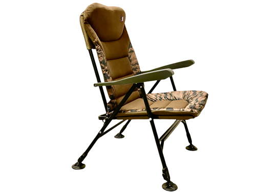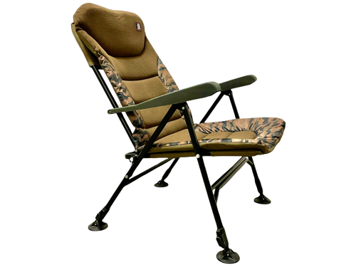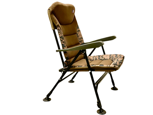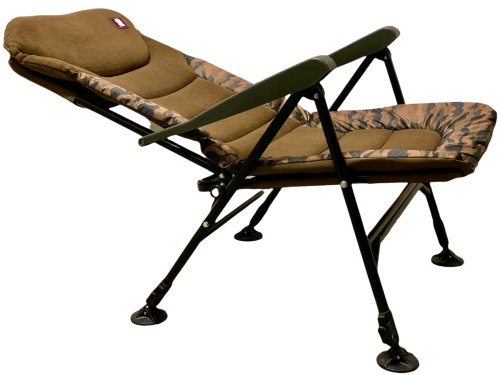 Rybárske a kemping luxusné kreslo s anatomicky tvarovaným operadlom a polstrovaným vankúšom v páčivom CAMO prevedení matraca. Pevná a stabilná konštrukcia je vybavená štyrmi výkyvnými a výsuvnými pätkami proti zaboreniu. Kreslo je vybavené unikátnym systémom naklápania operadla nadvihnutím opierok ruky. Hmotnosť 5,3 kg, Rozmer sedacej časti: 56x45cm, Rozmer chrbtovej časti: 56x71cm, Nosnosť 150kg