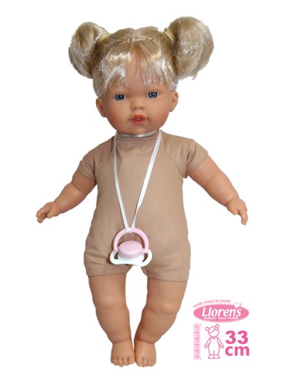 Hovoriaca a plačúca bábika (po vybratí poistky ihneď funkčná) s mäkkým látkovým telom as vláskami po celej hlave. Hlava a končatiny sú vyrobené z kvalitného mäkčeného vinylu. Po vytiahnutí cumlíka z úst začne bábika hovoriť „mama“, „papa“ a vydávať reálny zvuk plačúceho dieťaťa, ktorý je možné utíšiť opäť magnetickým cumlíkom. Veľkosť bábiky 33 cm. Ručne vyrobené v Španielsku, balené v igelitovom obale. Odporúčaný vek od 3 rokov. Tento model je bez oblečenia a preto odporúčame k bábike dokúpiť originálne oblečenie z ponuky Llorens pre bábiky veľkosti 33 cm. Súčasťou balenia je 3 x gombíková batéria LR44 s návodom na jej výmenu. Batérie sú spotrebný tovar a preto ich vybitie nie je dôvodom na reklamáciu bábiky.