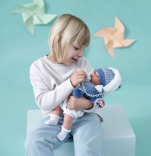 Hovoriaca a plačúca bábika (po vybratí poistky ihneď funkčná) s mäkkým látkovým telom as vláskami po celej hlave. Hlava a končatiny sú vyrobené z kvalitného mäkčeného vinylu. Po vytiahnutí cumlíka z úst začne bábika hovoriť „mama“, „papa“ a vydávať reálny zvuk plačúceho dieťaťa, ktorý je možné utíšiť opäť magnetickým cumlíkom. Veľkosť bábiky 38 cm. Ručne vyrobené v Španielsku, balené v darčekovej krabici. Odporúčaný vek od 3 rokov. K bábike je možné dokúpiť ďalšie originálne oblečenie z ponuky Llorens pre bábiky veľkosti 38 cm. Súčasťou balenia je 3 x gombíková batéria LR44 s návodom na jej výmenu. Batérie sú spotrebný tovar a preto ich vybitie nie je dôvodom na reklamáciu bábiky.