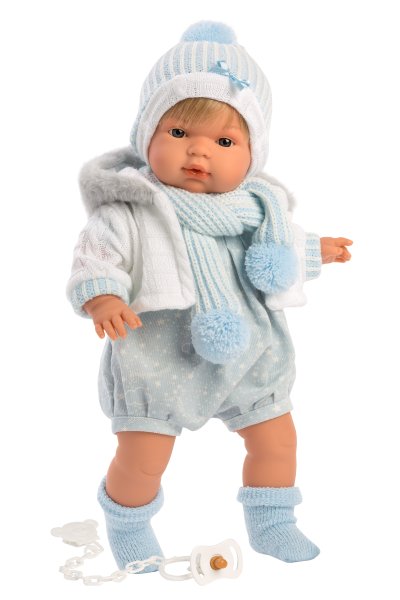 Hovoriaca a plačúca bábika (po vybratí poistky ihneď funkčná) s mäkkým látkovým telom as vláskami po celej hlave. Hlava a končatiny sú vyrobené z kvalitného mäkčeného vinylu. Po vytiahnutí cumlíka z úst začne bábika hovoriť „mama“, „papa“ a vydávať reálny zvuk plačúceho dieťaťa, ktorý je možné utíšiť opäť magnetickým cumlíkom. Veľkosť bábiky 38 cm. Ručne vyrobené v Španielsku, balené v igelitovom obale. Odporúčaný vek od 3 rokov. Tento model je bez oblečenia a preto odporúčame k bábike dokúpiť originálne oblečenie z ponuky Llorens pre bábiky veľkosti 38 cm. Súčasťou balenia je 3 x gombíková batéria LR44 s návodom na jej výmenu. Batérie sú spotrebný tovar a preto ich vybitie nie je dôvodom na reklamáciu bábiky.