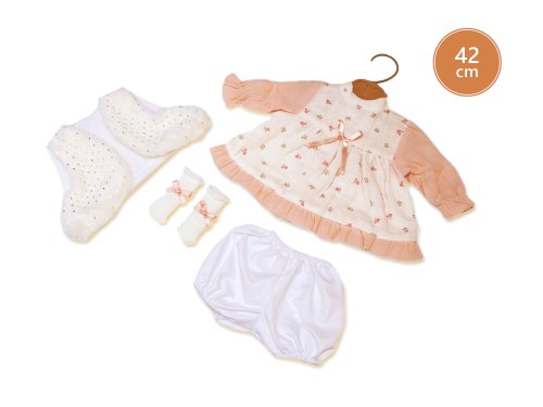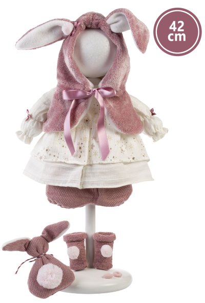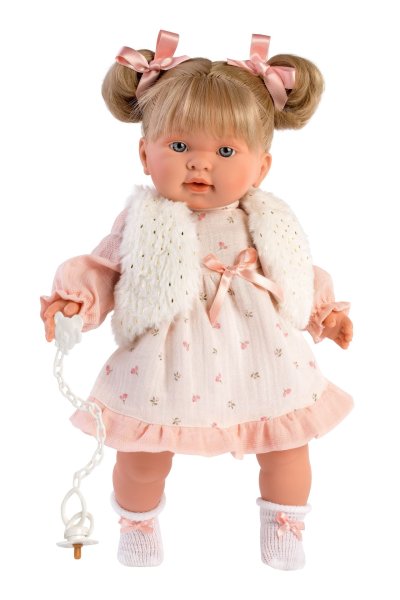 Hovoriaca a plačúca bábika (po vybratí poistky ihneď funkčná) s mäkkým látkovým telom as vláskami po celej hlave. Hlava a končatiny sú vyrobené z kvalitného mäkčeného vinylu. Po vytiahnutí cumlíka z úst začne bábika hovoriť „mama“, „papa“ a vydávať reálny zvuk plačúceho dieťaťa, ktorý je možné utíšiť opäť magnetickým cumlíkom. Veľkosť bábiky 42 cm. Ručne vyrobené v Španielsku, balené v igelitovom obale. Odporúčaný vek od 3 rokov. Tento model je bez oblečenia a preto odporúčame k bábike dokúpiť originálne oblečenie z ponuky Llorens pre bábiky veľkosti 42 cm. Súčasťou balenia je 3 x gombíková batéria LR44 s návodom na jej výmenu. Batérie sú spotrebný tovar a preto ich vybitie nie je dôvodom na reklamáciu bábiky.