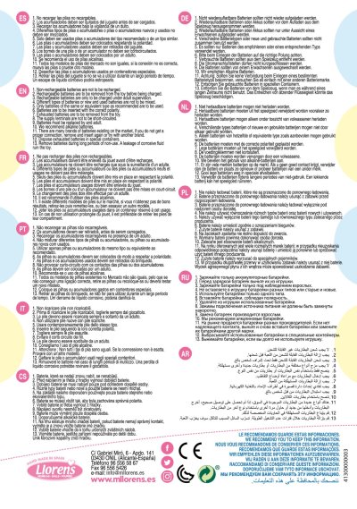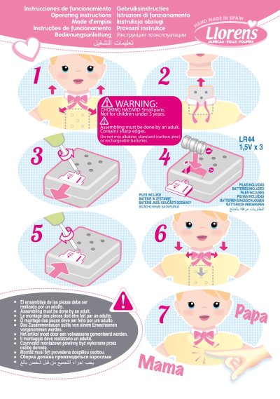 Hovoriace bábätko s mäkkým látkovým telom, ktoré po zatlačení na hrudník začne hovoriť „mama“, „papa“ a vydávať reálny zvuk plačúceho bábätka. Ruky a nohy sú k telu prichytené kĺbom. Bábätko je polohovacie a môže aj sedieť. Cumlík v balení slúži iba ako doplnok. Veľkosť 42 cm. Ručne vyrobené v Španielsku, balené v darčekovej krabici. Odporúčaný vek od 3 rokov. K bábätku je možné dokúpiť ďalšie originálne oblečenie z ponuky Llorens pre bábätká NEW BORN veľkosti 40-42 cm alebo 43-45 cm. Súčasťou balenia je 3 x gombíková batéria LR44 s návodom na jej výmenu. Batérie sú spotrebný tovar a preto ich vybitie nie je dôvodom na reklamáciu bábiky.