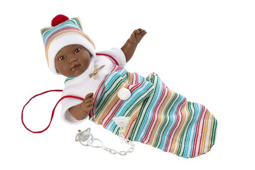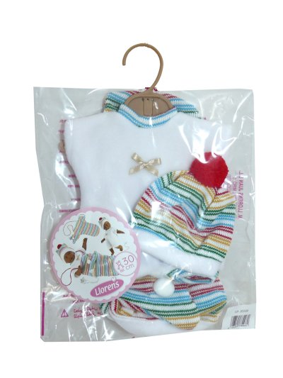 3dielny oblečok vrátane prenosného vaku na suchý zips pre bábiku bábätko Llorens veľkosti 30 cm. Vyrobené ručne v Španielsku, balené v igelitovom obale s plastovým ramienkom. Odporúčaný vek od 3 rokov.