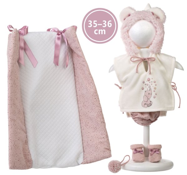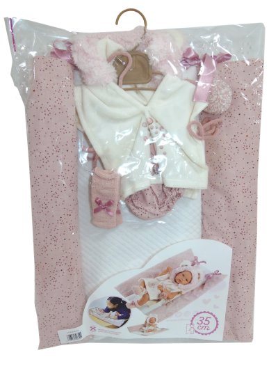 3dielny obleček s ozdobnou prebaľovacou podložkou a brmbolcom pre bábiku bábätko NEW BORN Llorens veľkosti 35-36 cm. Vyrobené ručne v Španielsku, balené v igelitovom obale s plastovým ramienkom. Odporúčaný vek od 3 rokov.