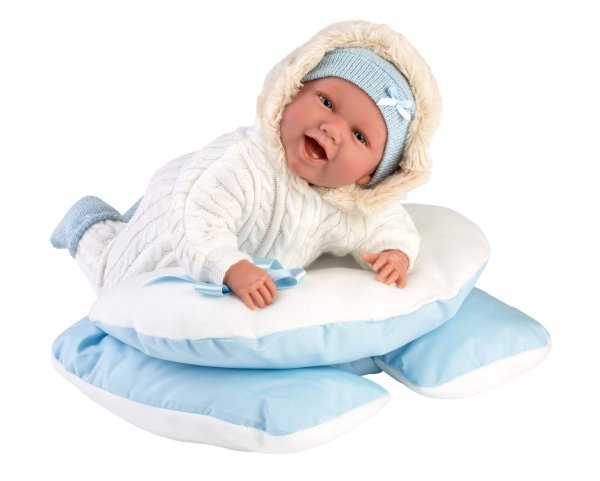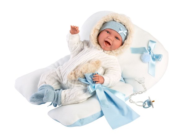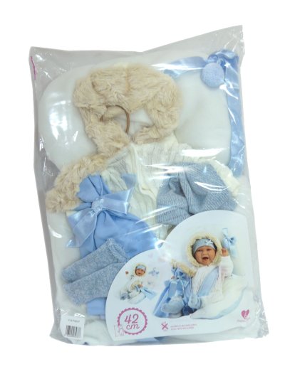 3dielny obleček s ozdobnou vreckovkou as podložkou s mašličkou a popruhmi, ktorú možno využiť ako stoličku pre bábiku bábätko NEW BORN Llorens veľkosti 40-42 cm. Vyrobené ručne v Španielsku, balené v igelitovom obale s plastovým ramienkom. Odporúčaný vek od 3 rokov.