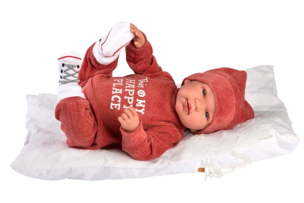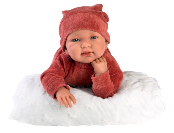 3dielny obleček s vankúšom využiteľným ako podložka a muchlacím vreckovkou s brmbolcom pre bábiku bábätko NEW BORN Llorens veľkosti 43-44 cm. Vyrobené v Španielsku, balené v igelitovom obale s plastovým alebo kartónovým ramienkom. Odporúčaný vek od 3 rokov.