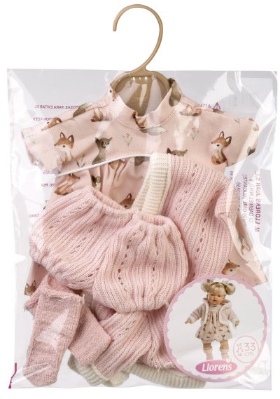 4 kusy oblečenia pre bábiku Llorens veľkosti 33 cm. Vyrobené ručne v Španielsku, balené v igelitovom obale s plastovým ramienkom. Odporúčaný vek od 3 rokov.