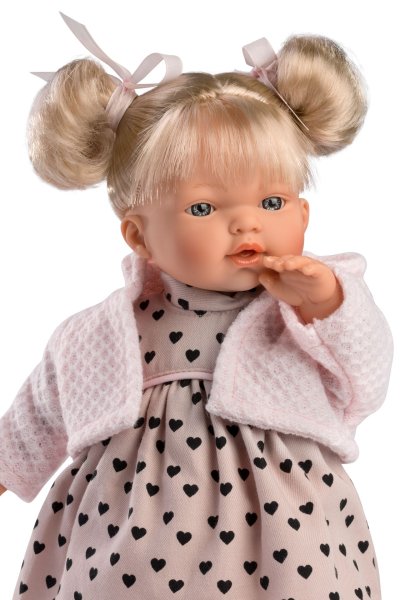 4dielny obleček pre bábiku Llorens veľkosti 33 cm. Vyrobené ručne v Španielsku, balené v igelitovom obale s plastovým ramienkom. Odporúčaný vek od 3 rokov.