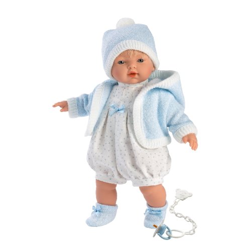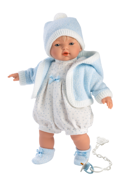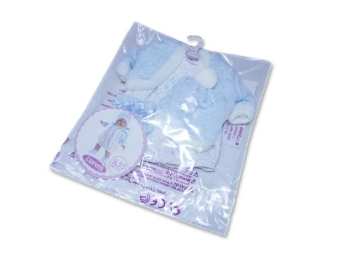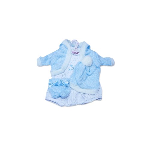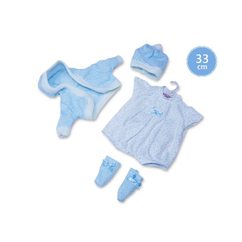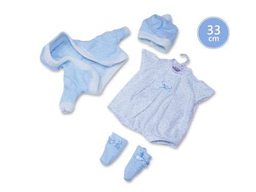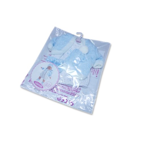 4dielny obleček pre bábiku Llorens veľkosti 33 cm. Vyrobené v Španielsku, balené v igelitovom obale s plastovým alebo kartónovým ramienkom. Odporúčaný vek od 3 rokov.