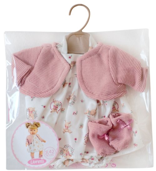 4 kusy oblečenia pre bábiku Llorens veľkosti 42 cm. Vyrobené ručne v Španielsku, balené v igelitovom obale s plastovým ramienkom. Odporúčaný vek od 3 rokov.
