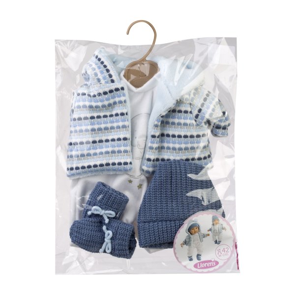 4dielny obleček pre bábiku Llorens veľkosti 42 cm. Vyrobené ručne v Španielsku, balené v igelitovom obale s plastovým ramienkom. Odporúčaný vek od 3 rokov.