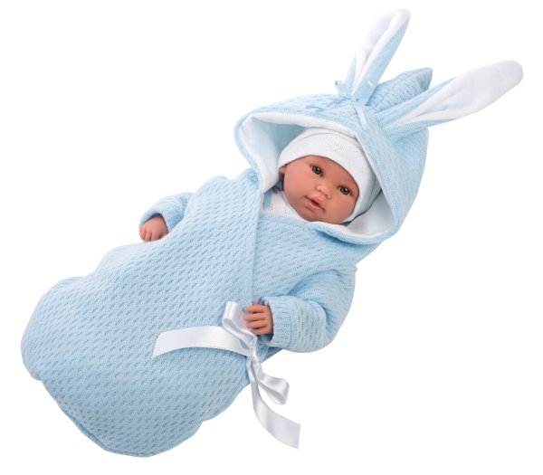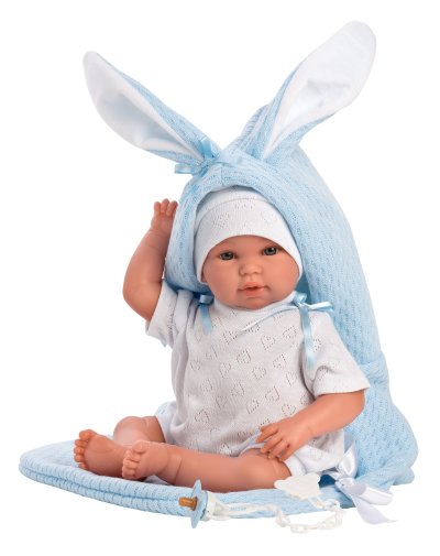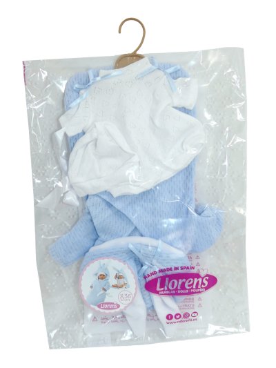 2dielny obleček s rýchlozavinovacím overalom s kapucňou s uškami pre bábiku bábätko NEW BORN Llorens veľkosti 35-36 cm. Vyrobené ručne v Španielsku, balené v igelitovom obale s plastovým ramienkom. Odporúčaný vek od 3 rokov.