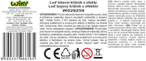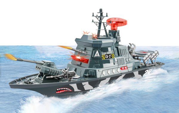 Loď bojový krížnik s efektmi. Veľkosť 59 cm. Vydáva svetelné a zvukové efekty, rotujúce radar. Aktivácia efektov 4 tlačidlá na strane lode - zvuky lodí, streľby, výbuchov. 3xAA batérie nie sú súčasťou.