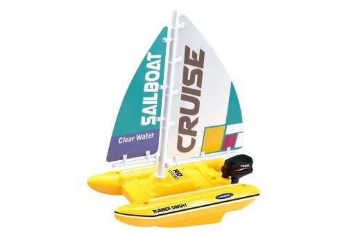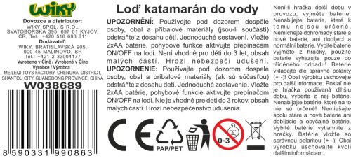 Loď katamarán. Rozmery 19x9,5x25 cm. 2xAA batérie nie sú súčasťou. Prepínač ON/OFF v zadnej časti lode pred motorom. 2 farebné varianty - žltá, červená.