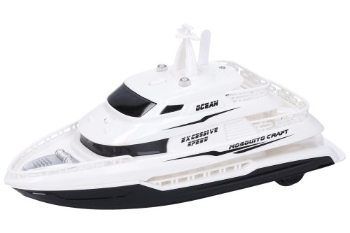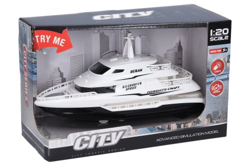 Loď na zotrvačník s efektmi, biela. Rozmery 22x7x10 cm. Vydáva svetelné a zvukové efekty. Batéria 3xAG13, súčasťou balenia.