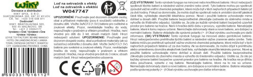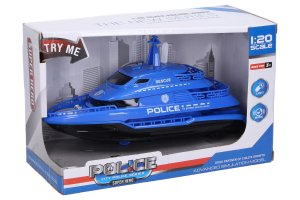 Loď na zotrvačník s efektmi, modrá. Rozmery 22x7x10 cm. Vydáva svetelné a zvukové efekty. Batéria 3xAG13, súčasťou balenia.