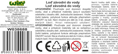 Loď závodná. Rozmery 21x6,5x25 cm. 2xAA batérie nie sú súčasťou. Prepínač ON/OFF v zadnej časti lode nad motorom. 2 farebné varianty: modrá, biela