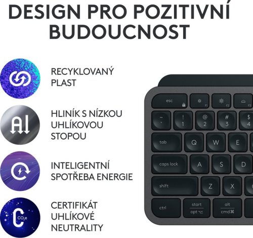 Podsvietené klávesy sa rozsvietia, keď sa vaše ruky priblížia ku klávesnici, a ich jas sa automaticky zníži alebo zvýši s ohľadom na vaše prostredie. Ovládajte dobu a jas podsvietenia klávesnice MX Keys S v Logi Options+