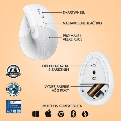 Myš Logitech Lift sa môže pochváliť radom funkcií, ktoré vylepšia váš pracovný priestor a pomôžu vám byť efektívnejšie. Rýchle a presné prechádzanie obsahom zaistí koliesko SmartWheel, o prispôsobenie myši na maximum sa postará jednoduchý softvér Logi Options+, s ktorého pomocou ľahko priradíte funkcie 4 ľahko prístupným tlačidlám – od stlmenia mikrofónu po prevádzanie hlasu na text s OSDictation. Funkcia Easy Switch potom zaistí ľahké prepínanie medzi až 3 zariadeniami, medzi ktorými je možné dokonca presúvať súbory pomocou technológie Logitech Flow.