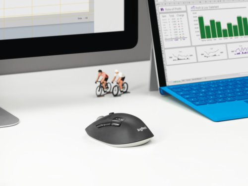 Všestranná, výkonná myš Myš Logitech M720 Triathlon vďaka technológii Easy-Switch sa dokáže prepojiť až s tromi zariadeniami naraz, pomocou Bluetooth.